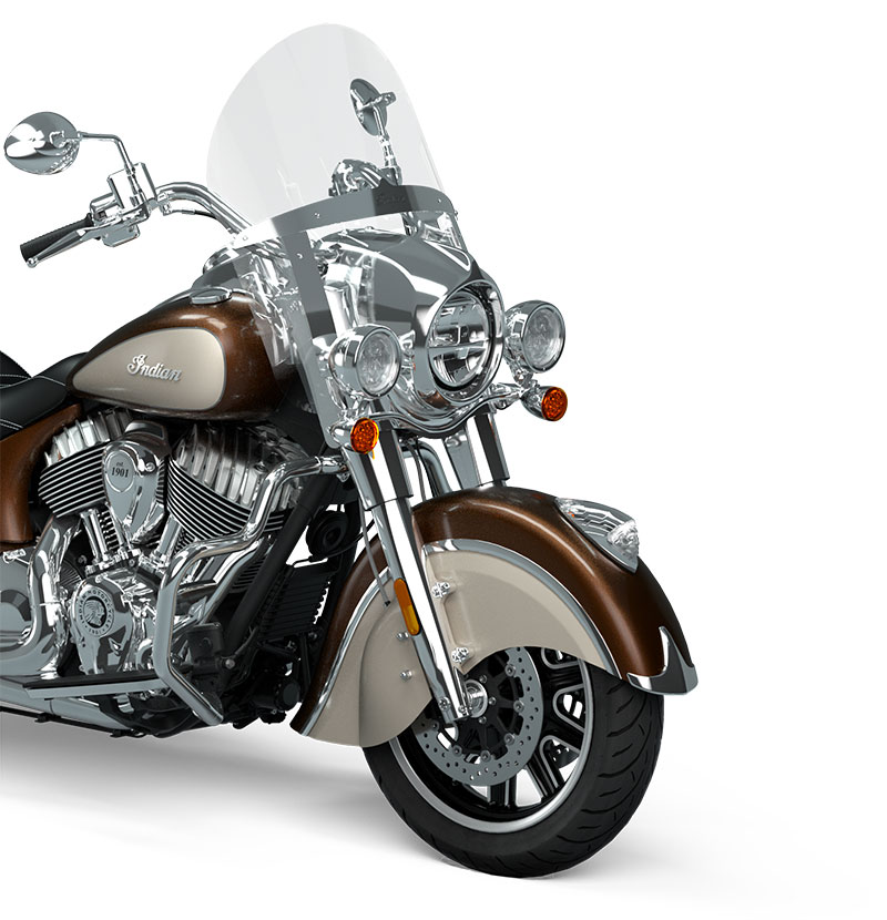 | Standard Equipment | Quick Release Windshield; Genuine Leather Seat; Remote-Locking Hard Saddlebags, Highway Bars; Tyre Pressure Monitoring; Light Bar; Selectable Ride Modes, ABS; Cruise Control; Keyless Ignition; Indian® Script Tank Badge; 12v Charging Port |